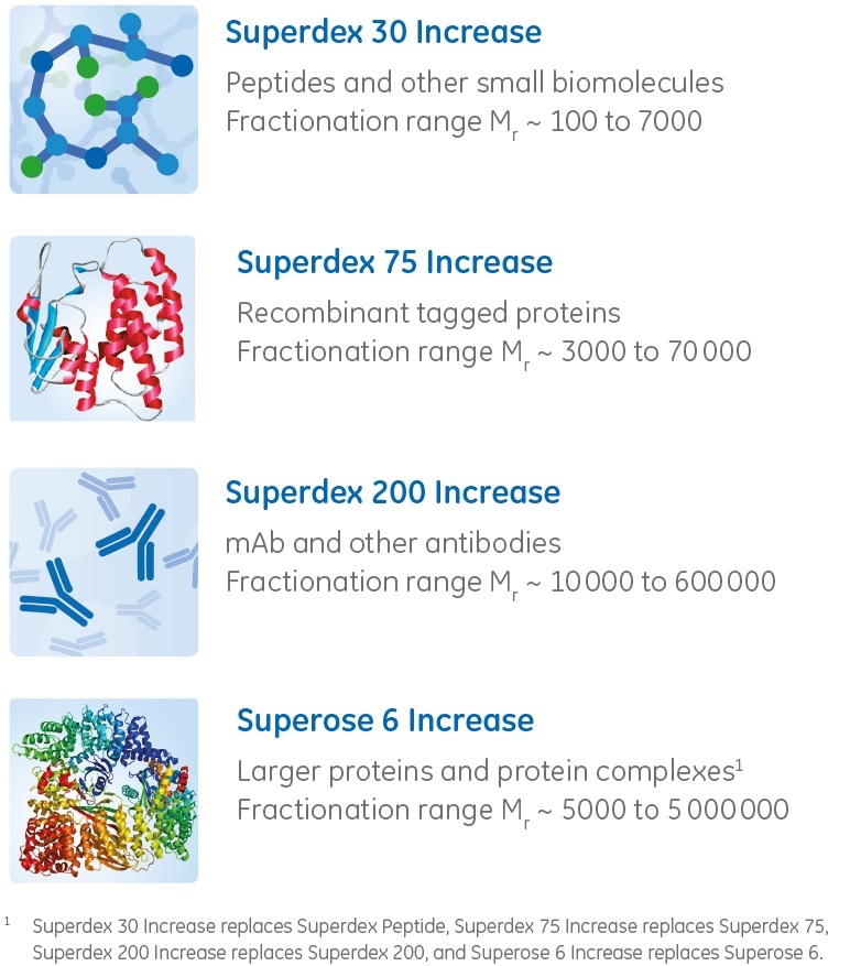 New generation agarose-based size exclusion chromatography resins from GE Healthcare are well-suited to biomolecular analysis. The columns together cover separation of a broad molecular weight range (Mr 100 to 5000000) from small peptides up to large protein complexes. The image to the right shows the four different resins available Superdex™ 30 Increase, Superdex 75 Increase, Superdex 200 Increase and Superose™ 6 Increase), together with recommended areas of analysis.